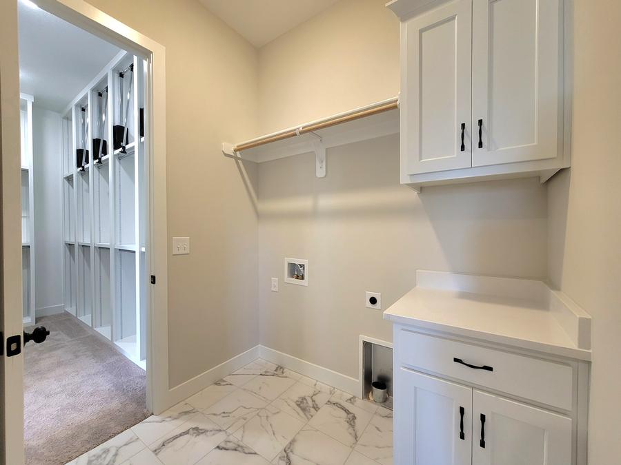 - Upper cabinet, and hanging rod with shelf, plus level 1 quartz or Granite Countertop in Laundry