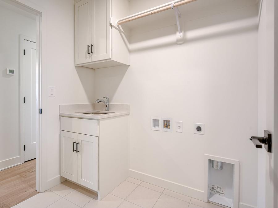 - Upper cabinet, and hanging rod with shelf, plus lower solid surface countertop in Laundry